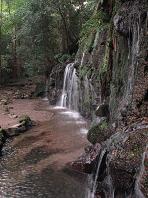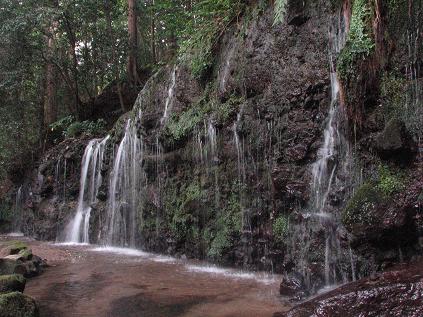 高さ3m、幅10mほどの小さな美しい滝。岩壁の上から流れ落ちる水が