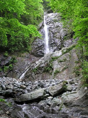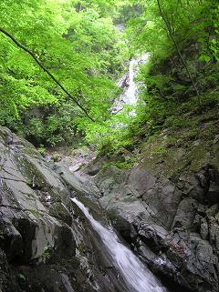 表丹沢で、最大の大滝です。 三段に別れていて、実際に見えるのは 中段の25mと下段の10m部分のみです。 下から見上げると、新緑の時期という事もあって