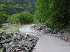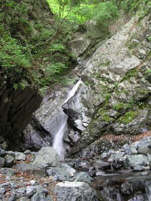 寄沢本流にあります。まず、滝郷滝を過ぎて 雨山峠という標示にしたがって、登山道を歩きま す。2kmほど歩いて開けた河原に出てたあたりで 左右に沢が別れます。少し戻るようにして 左の沢を進むと、すぐにF1のくの字の滝がありま す。 ここまでは40分〜50分です。 |