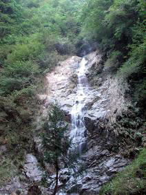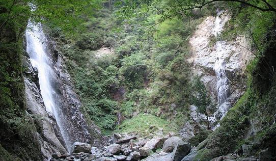 本棚の向かいに落ちる、落差20mほどの滝です。写真では、左が本棚。涸棚は右です。